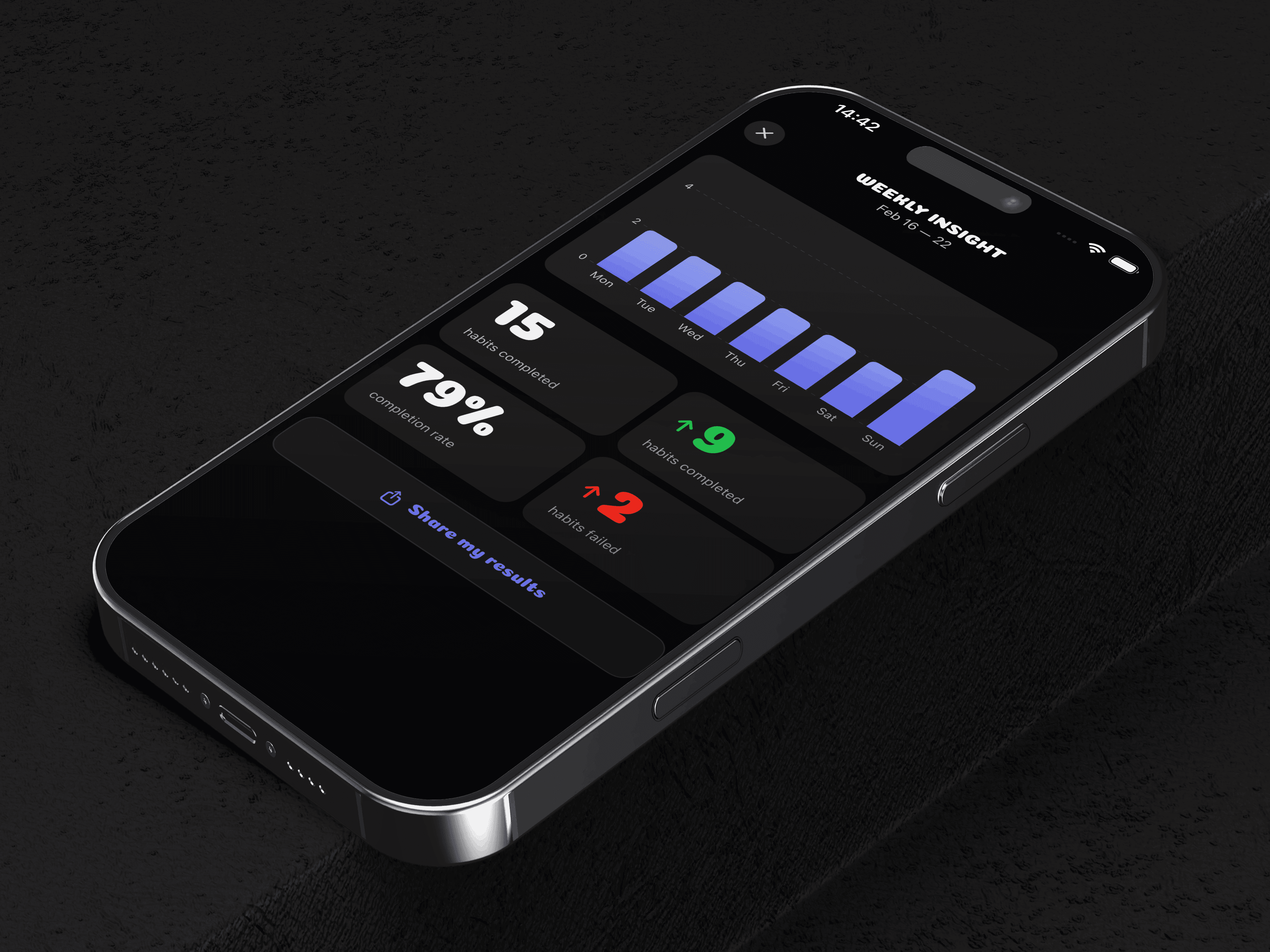 • Weekly Insight — Every Monday at 9 AM, a banner appears above today's progress inviting the user to view their weekly report. The report shows a bar chart of habits completed per day, four summary stats (total completions, week-over-week trend, completion rate, and failed habits), and a share button that generates a PNG image card. A repeating Monday 9 AM notification is scheduled when notifications are enabled.